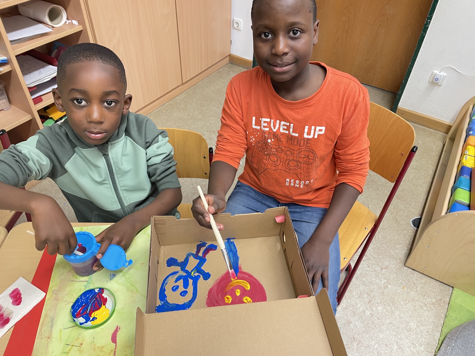 Die Kinder der ersten Klasse haben zusammen mit ihren Paten der Klasse 6/7 kleine Betten für ihre Kuscheltiere gebastelt.